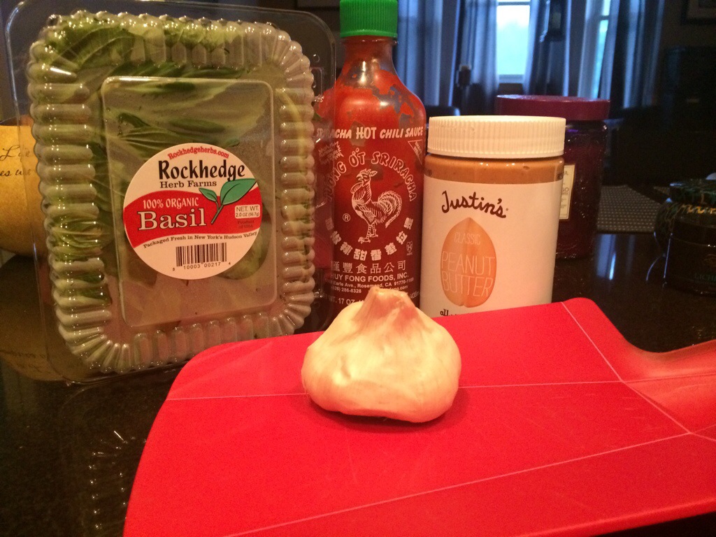 Set a pot of water on the stove and bring to a boil. Heat olive oil in a saucepan over medium/low heat. Add basil, garlic and chili pepper sauce. Let flavors meld and garlic begin to brown. Add next 4 ingredients to pan and mix together. A whisk is very helpful here! Keep sauce over a low flame stirring regularly. As you are finishing the sauce your water should be coming to a rapid boil. Throw in your pasta and cook according to package directions. Just before the pasta is done throw in the broccoli for a quick boil. Drain pasta and broccoli together, reserving 1 cup of pasta water. Toss with peanut sauce and garnish with fresh basil leaves. If you feel the noodles are too sticky you can add reserved pasta water a little at a time to get desired consistency.