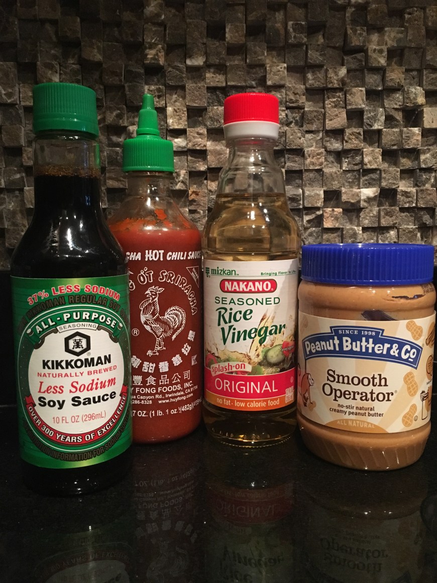 In a small saucepan, heat oil over medium heat and add garlic. Cook until the garlic starts to become fragrant and begins to brown. Add soy sauce, rice wine vinegar, water and ginger. Mix well to incorporate and heat through about 3-5 minutes. Remove pan from heat and add peanut butter and sriracha. With a whisk mix well until the sauce becomes smooth. If you prefer more spice, add more sriracha and if you prefer a thinner sauce you can add water 1/2 tbsp at a time to get your preferred consistency. Or if you are like me you prepared the sauce and then did bath time and when you came back it was too thick, I got your back moms! Just add a little warm water to thin it out!