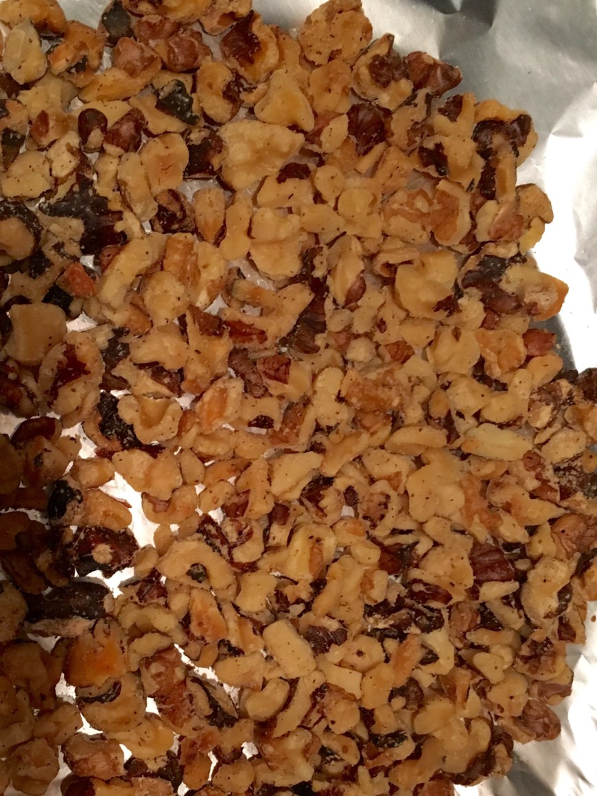 To toast the walnuts, place on a cookie sheet and bake at 400 degrees for around 10 minutes. You will start to smell the walnuts as they are toasting which is so delicious!