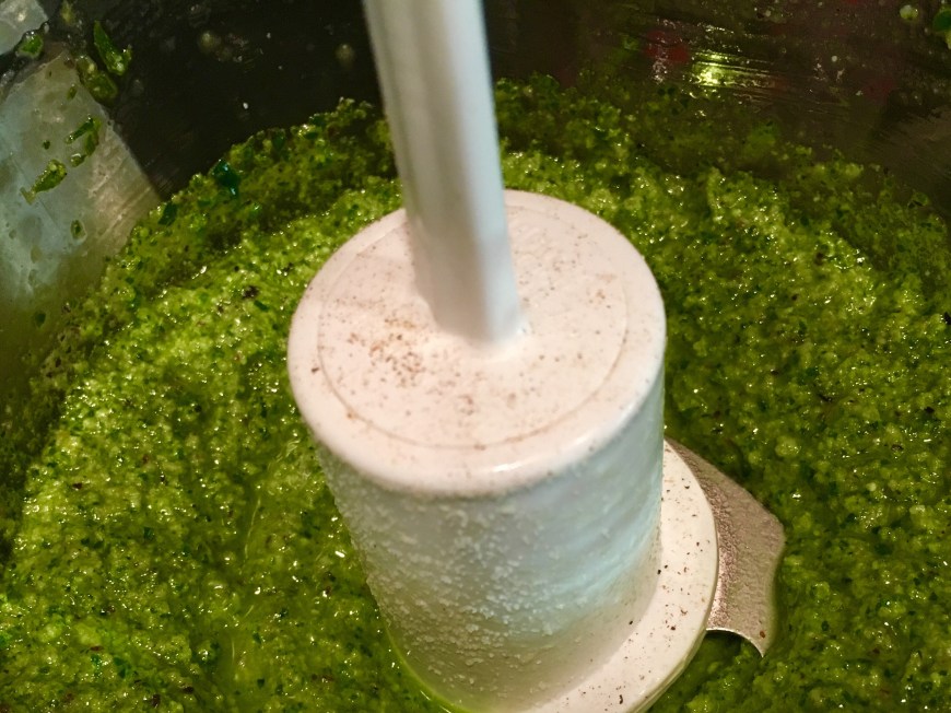 Pesto is very versatile and you can experiment with the ingredients. For Easter, I made a mint pesto to serve as a sauce for grilled baby lamb chops. You could try pine nuts and baby kale, walnuts and basil or even try mixing the nuts together.