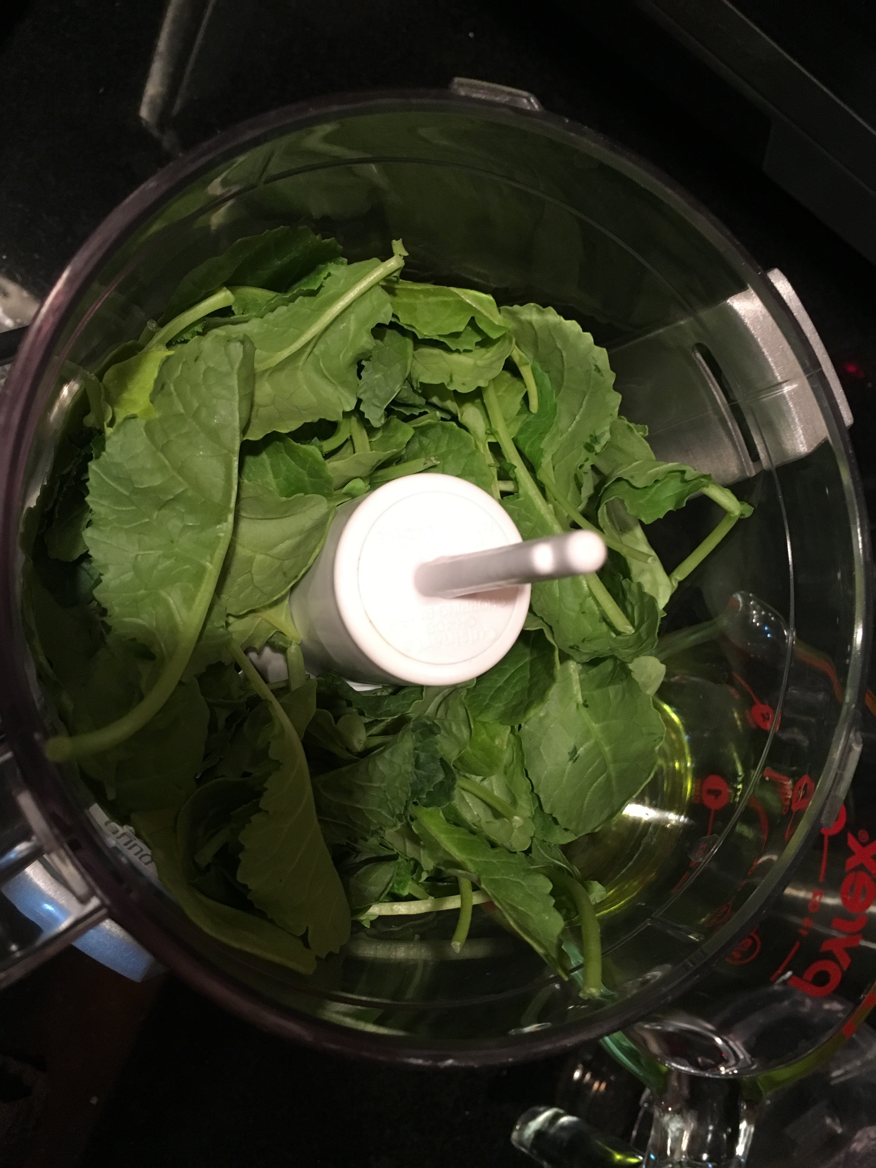 Place baby kale, walnuts, cheese and garlic in a food processor or blender and pulse to break down ingredients. Slowly add olive oil until the mixture becomes a creamy paste.