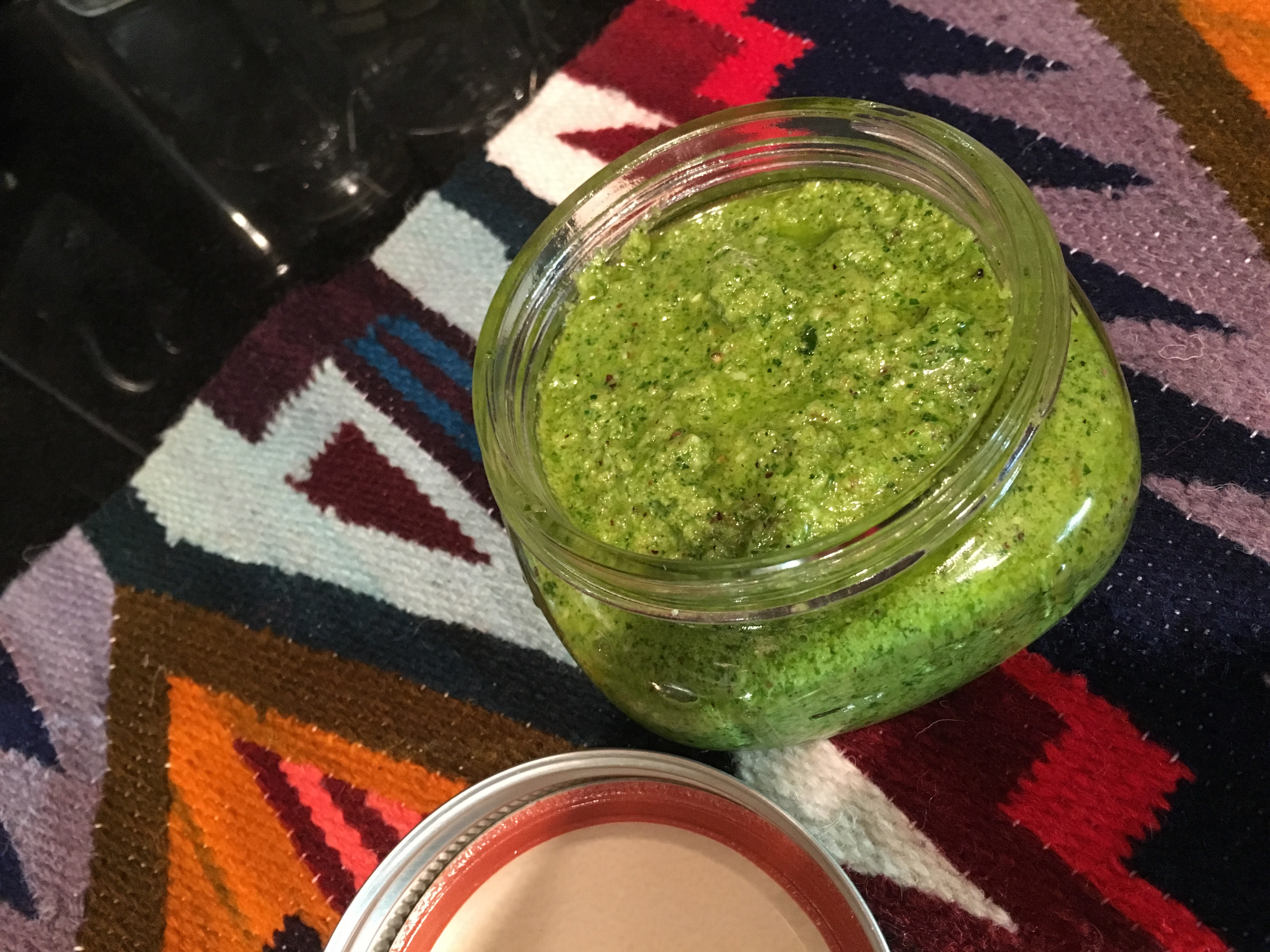 Pesto is very versatile and you can experiment with the ingredients. For Easter, I made a mint pesto to serve as a sauce for grilled baby lamb chops. You could try pine nuts and baby kale, walnuts and basil or even try mixing the nuts together.