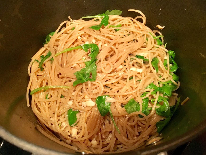 Back to the recipe, when your pot of water comes to a rapid boil, add salt and return to a boil. Add the pasta and cook based on package directions and your liking. Some people prefer a little more bite to their pasta or al dente in Italian (meaning to the tooth). Drain the pasta and return it to the pot, pour the sauce over it and mix well to incorporate. Add a good handful of arugula and mix well. The arugula will wilt with the heat of the pasta and give you a delicious peppery pop! Top with grated cheese and dinner is served.