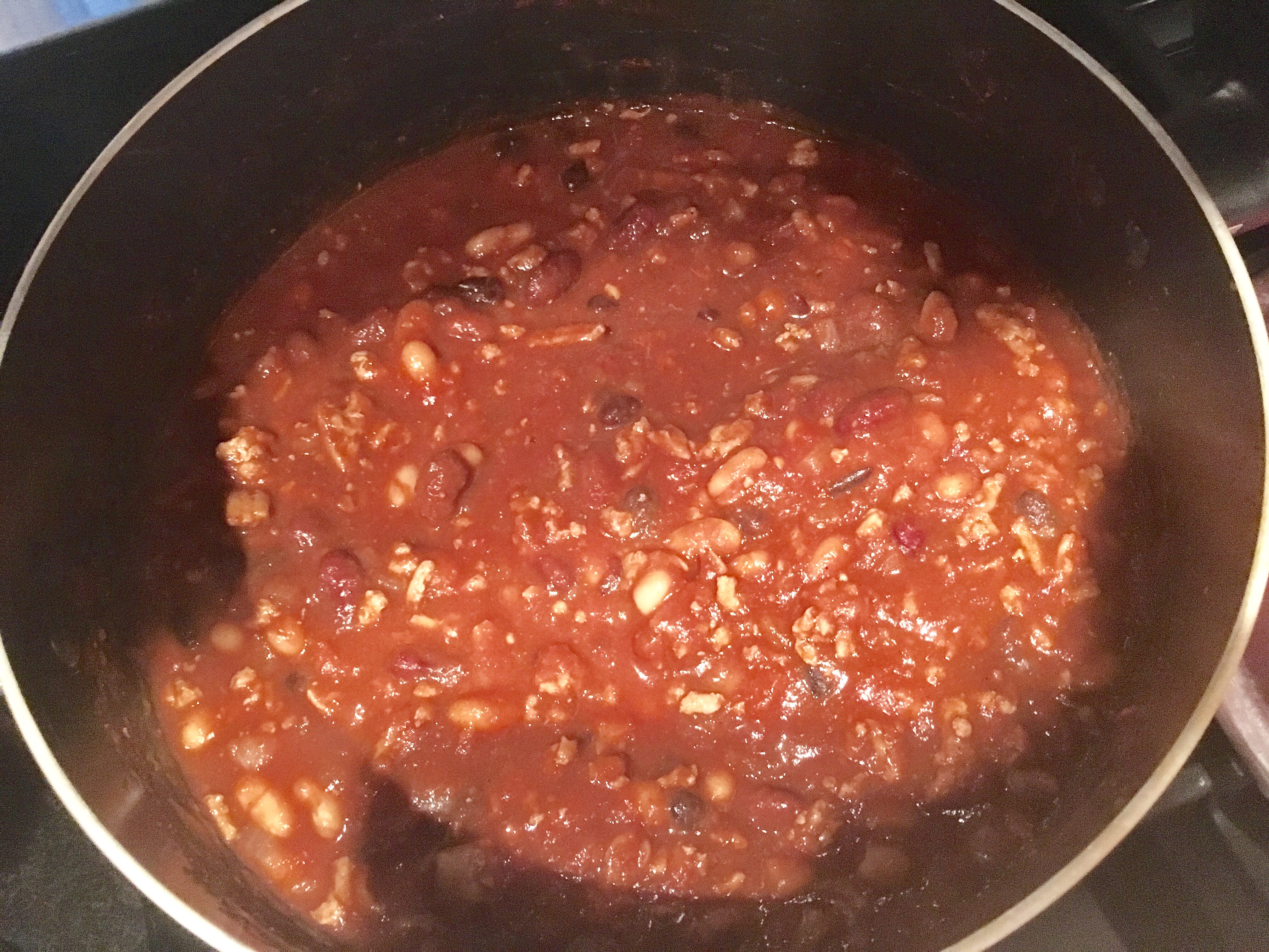 In a medium to large pot, heat 1 tbsp of olive oil over a medium heat. Add ground turkey and cook until browned. While the turkey is cooking chop your onion. Remove the turkey from the pot and put in a bowl. In the same pot, heat the remaining olive oil and add the chopped onion. Cook until the onions start to become translucent. Add the meat back to the pan and mix will to incorporate the onions. Next, add the tomatoes and beans (with the liquid) to the meat mixture and stir well.